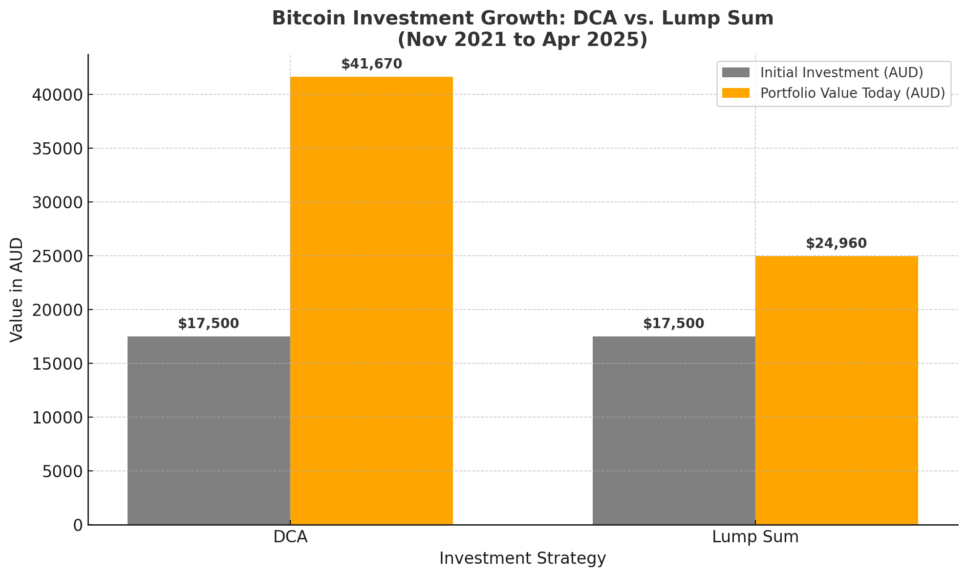 If you invested AUD $100 into Bitcoin every week from November 2021 (peak of that cycle) until now, you’d have invested a total of $17,500.
